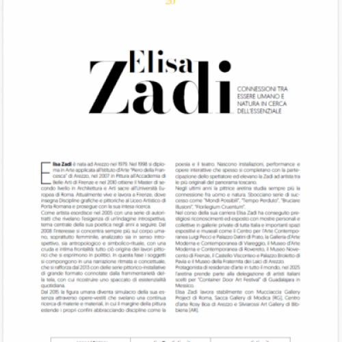 Il lavoro di Elisa Zadi esplora le questioni della femminilità, dell’identità e dell’appartenenza attraverso il ritratto e l’autoritratto. Il suo percorso si sviluppa indagando la connessione fra uomo e natura sia in senso introspettivo che antropologico e simbolico. Artista poliedrica si occupa di pittura, installazione, performance e poesia.