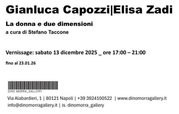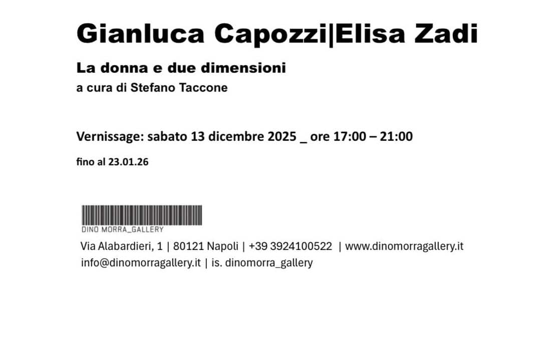 DINOMORRA GALLERY è lieta di presentare La donna e due dimensioni una mostra di Gianluca Capozzi ed Elisa Zadi a cura di Stefano Taccone, che inaugurerà a Napoli il 13 dicembre 2025 alle ore 17:00 presso gli spazi della galleria in via Alabardieri, 1.