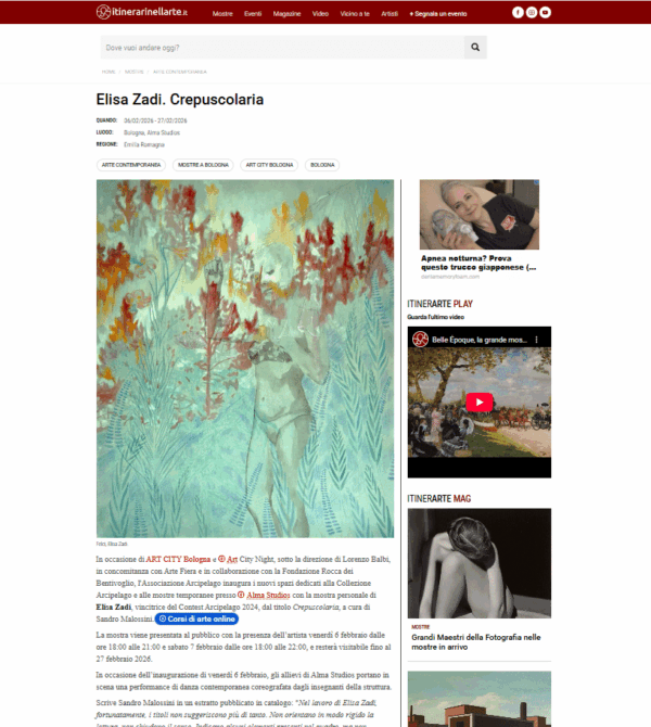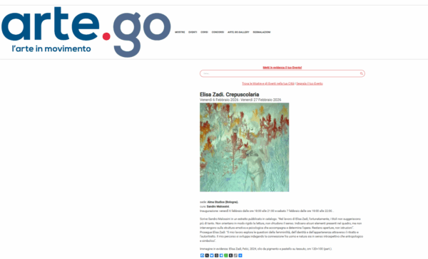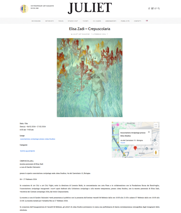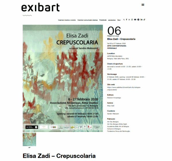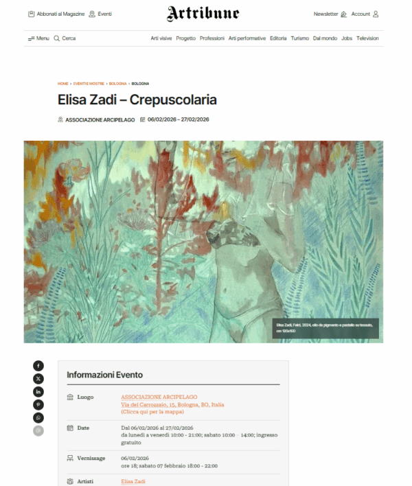 In occasione di Art City e Art City Night, sotto la direzione di Lorenzo Balbi, in concomitanza con Arte Fiera e in collaborazione con la Fondazione Rocca dei Bentivoglio, l'Associazione Arcipelago inaugurerà i nuovi spazi dedicati alla Collezione Arcipelago e alle mostre temporanee, presso Alma Studios, con la mostra personale di Elisa Zadi, vincitrice del Contest Arcipelago 2024, dal titolo Crepuscolaria.